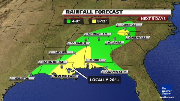 My dad called me this morning and said New Orleans is expected to get more than 20 inches of rain over the weekend. I didn’t believe him — that sound’s ridiculous. Surely I would have heard about this, seeing as most of New Orleans lies below sea level and its reputation for being flooded is now global. Seeing as the media made such a big mess out of Irene, which turned out to be more or less nothing, I would hear about a tropical depression slamming into New Orleans, right?